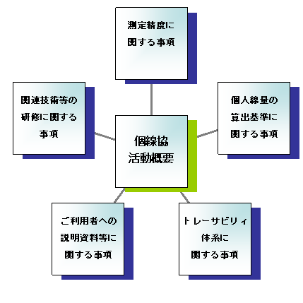 個線協は、メンバー各社の個人線量測定技術の維持向上を目指し、次のような各テーマを対象として関係法令及びJIS等の技術基準との適合性等をはじめ、個人モニタリングサービスの信頼度向上に必要となる事項について協議しています。
