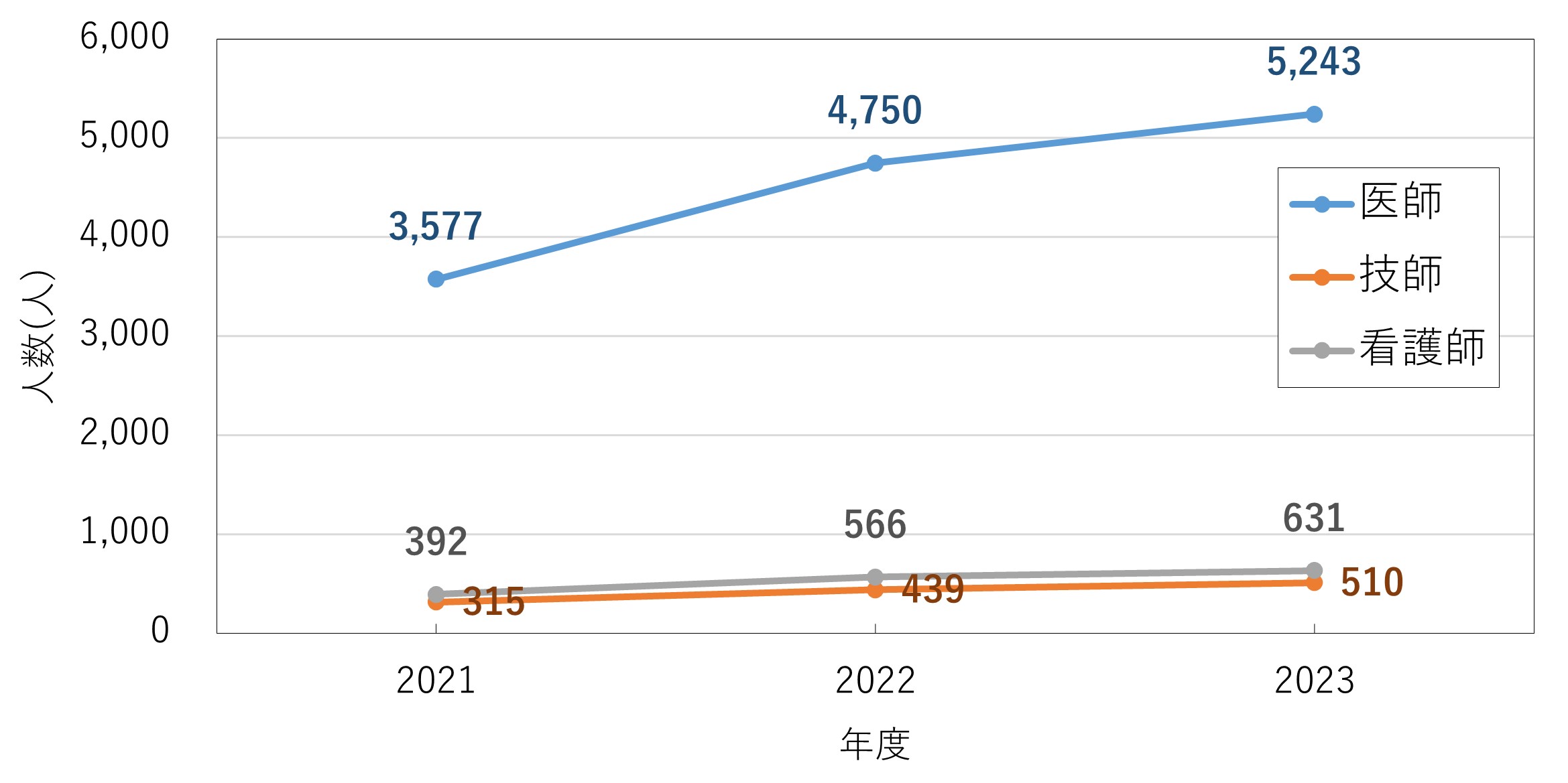 図2は、医療分野職種別の眼の水晶体用線量計の使用者数の推移を示しており、いずれの職種においても増加傾向があり、医師が技師および看護師と比較して使用者数が大きく増加しました。