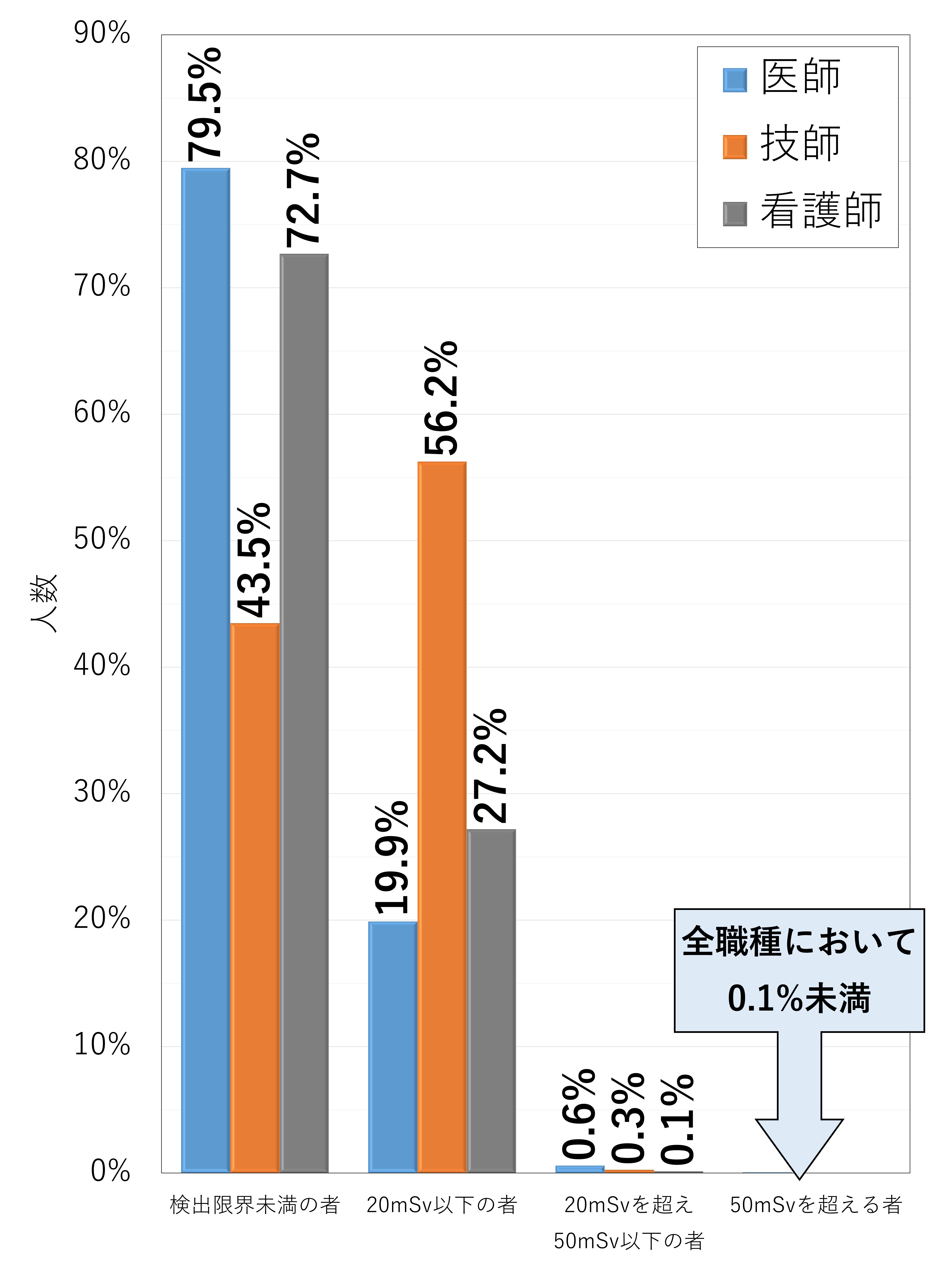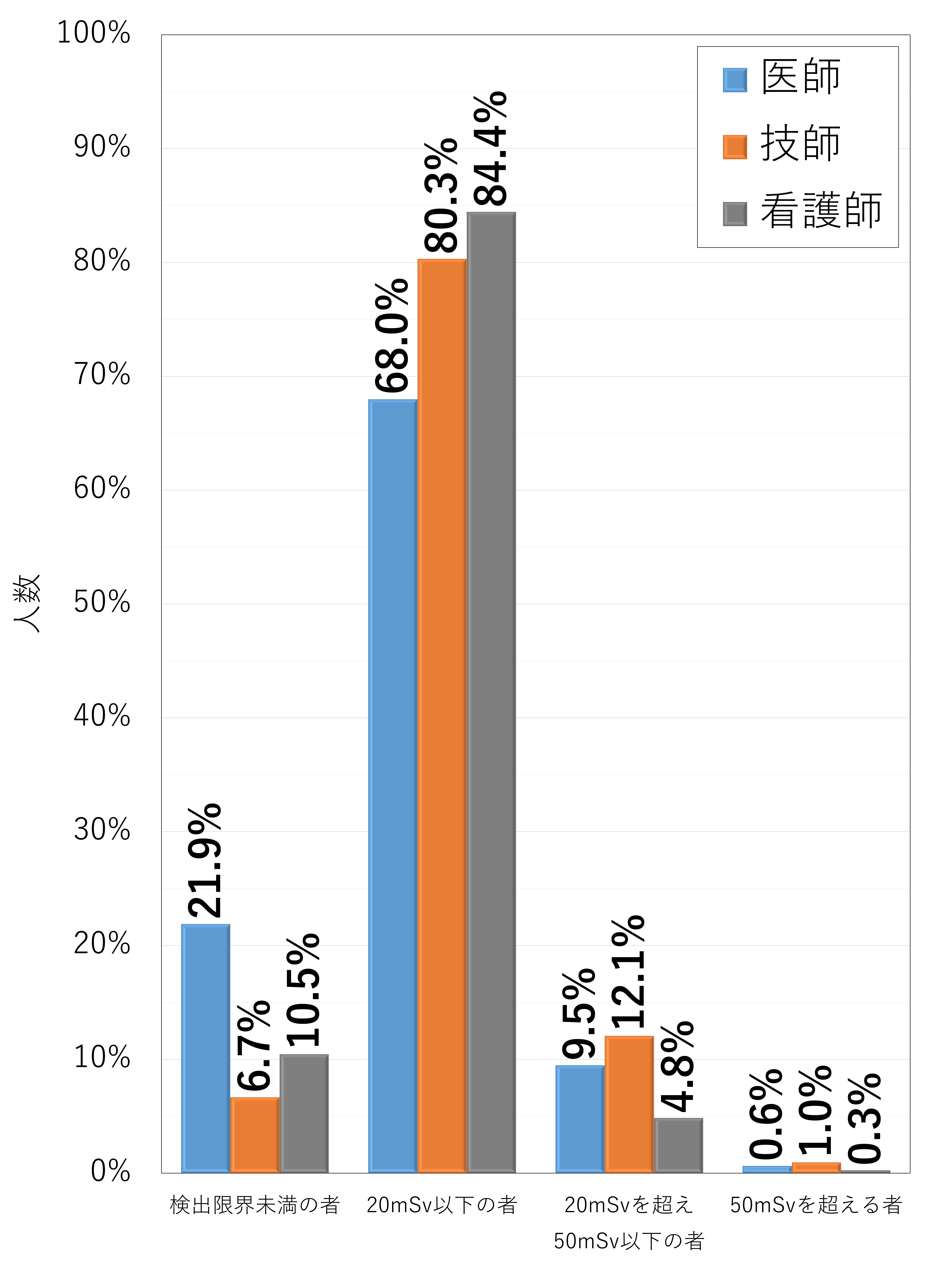 図1は、関係法令改正前(2020年度)の医療分野の眼の水晶体の年等価線量分布を示しており、医師の79.5%、技師の43.5%、看護師の72.7%は検出限界未満でした。関係法令改正後の線量限度である50mSv/年を超過している人数の比率は、いずれの職種においても0.1%未満でした。
