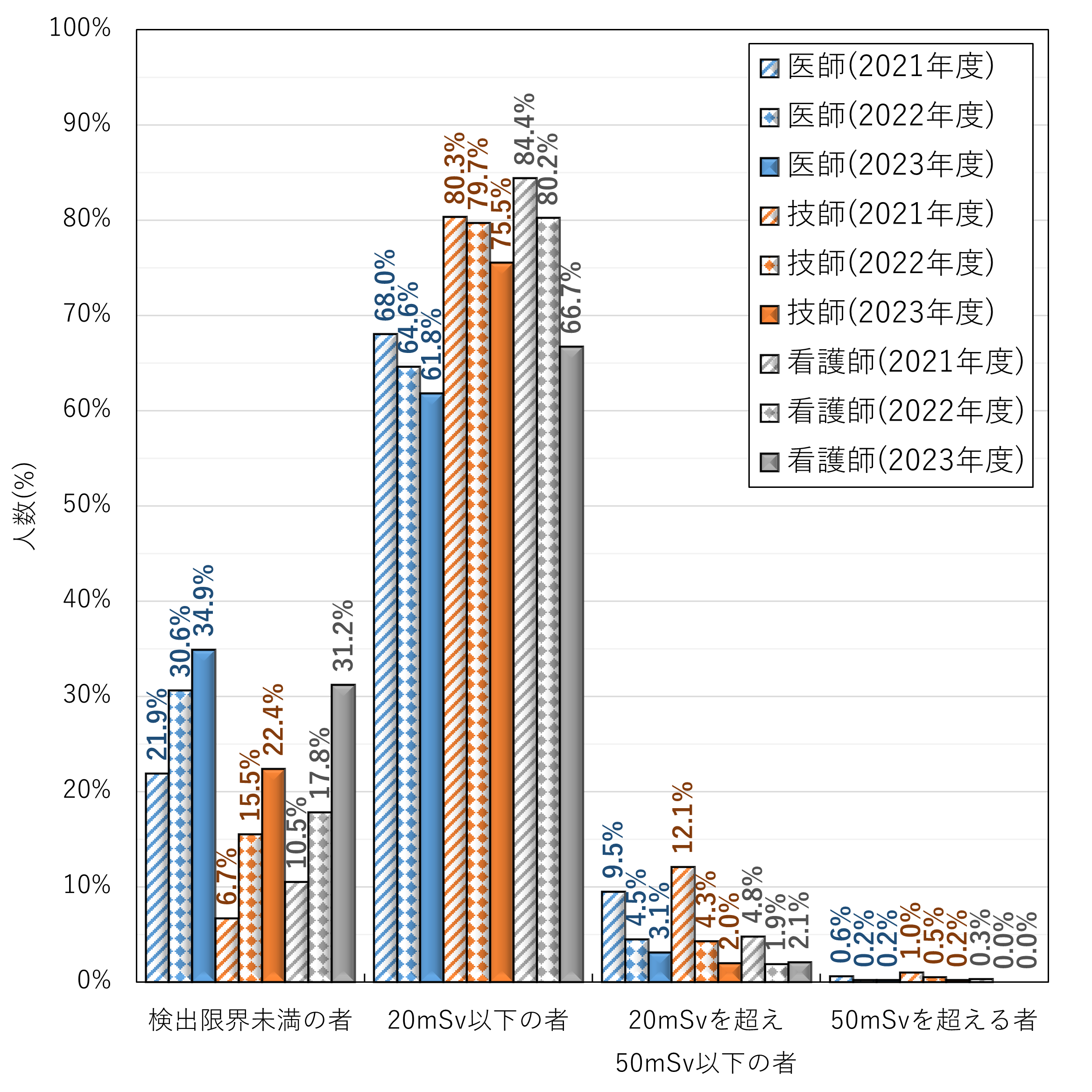 図3は、眼の水晶体用線量計使用者の医療分野職種別における眼の水晶体の等価線量分布を示しており、いずれの職種においても低線量区分にシフトしている傾向が確認できました。