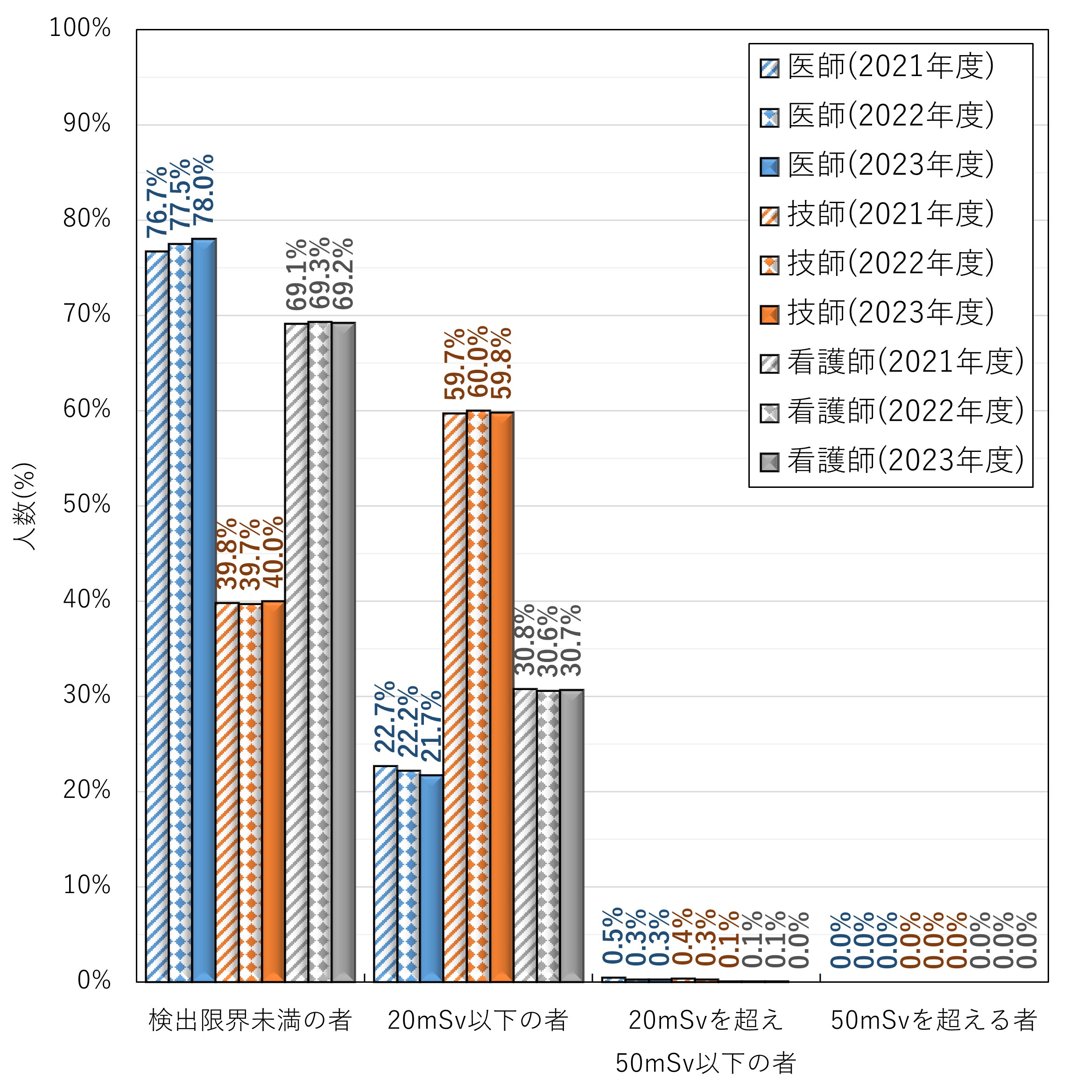 個線協メンバー会社の個人線量測定サービスを1度でもご利用いただき、個人線量を報告した医療分野の医師、技師、看護師の方を対象に、眼の水晶体の年等価線量を集計しました。なお、集計対象期間については、関係法令改正後の2021年度(令和3年度)から2023年度(令和5年度)としました。線量の集計区分については、電離放射線健康診断結果報告書における区分としました。